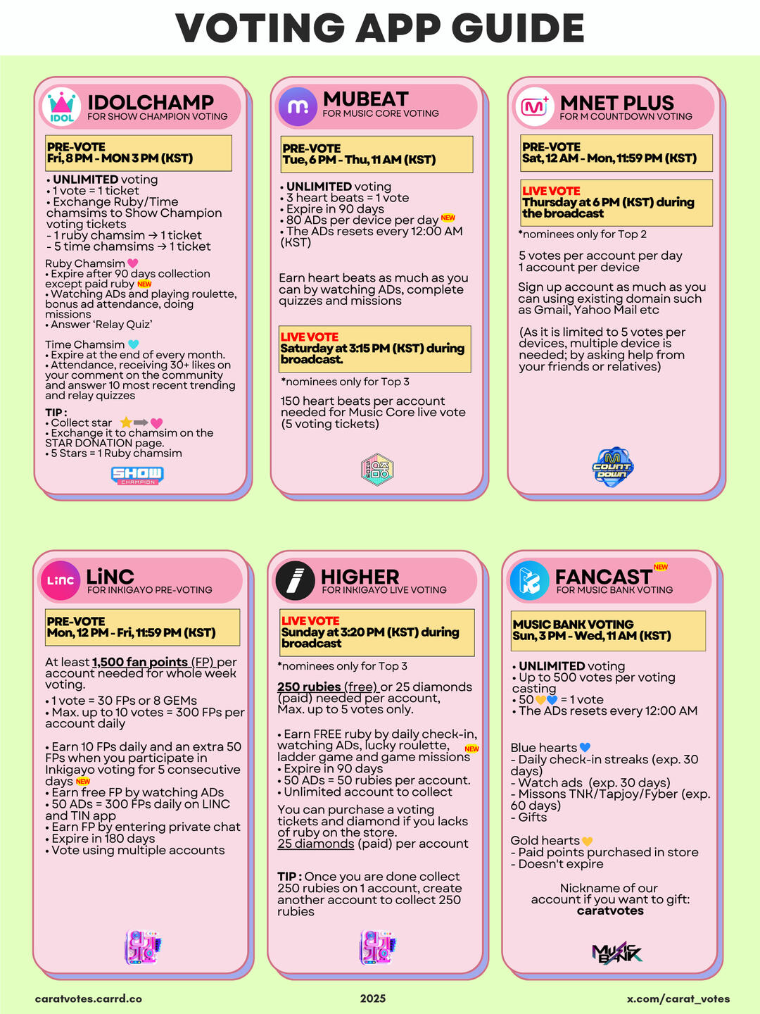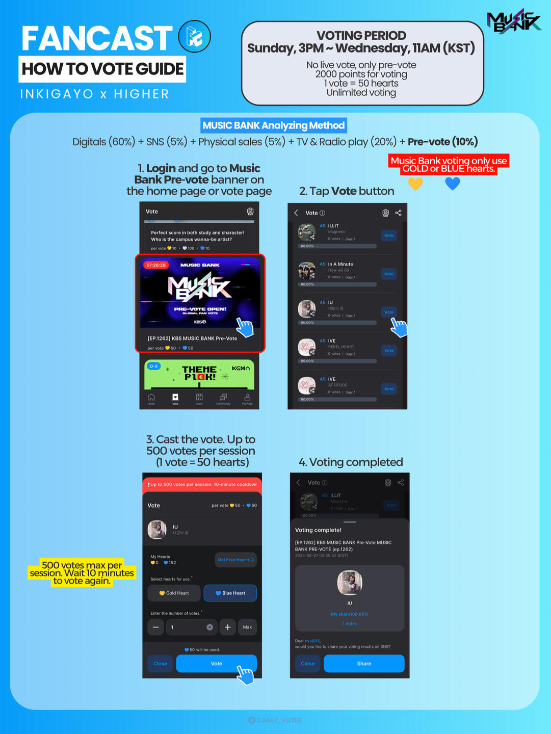 Music Bank has changed voting platform from ALLCHART app to FANCAST app starting August 2025.Pre-vote: Sunday, 3 PM - Wednesday, 11AM (KST).Install App: iOS | AndroidCREATE AN ACCOUNT