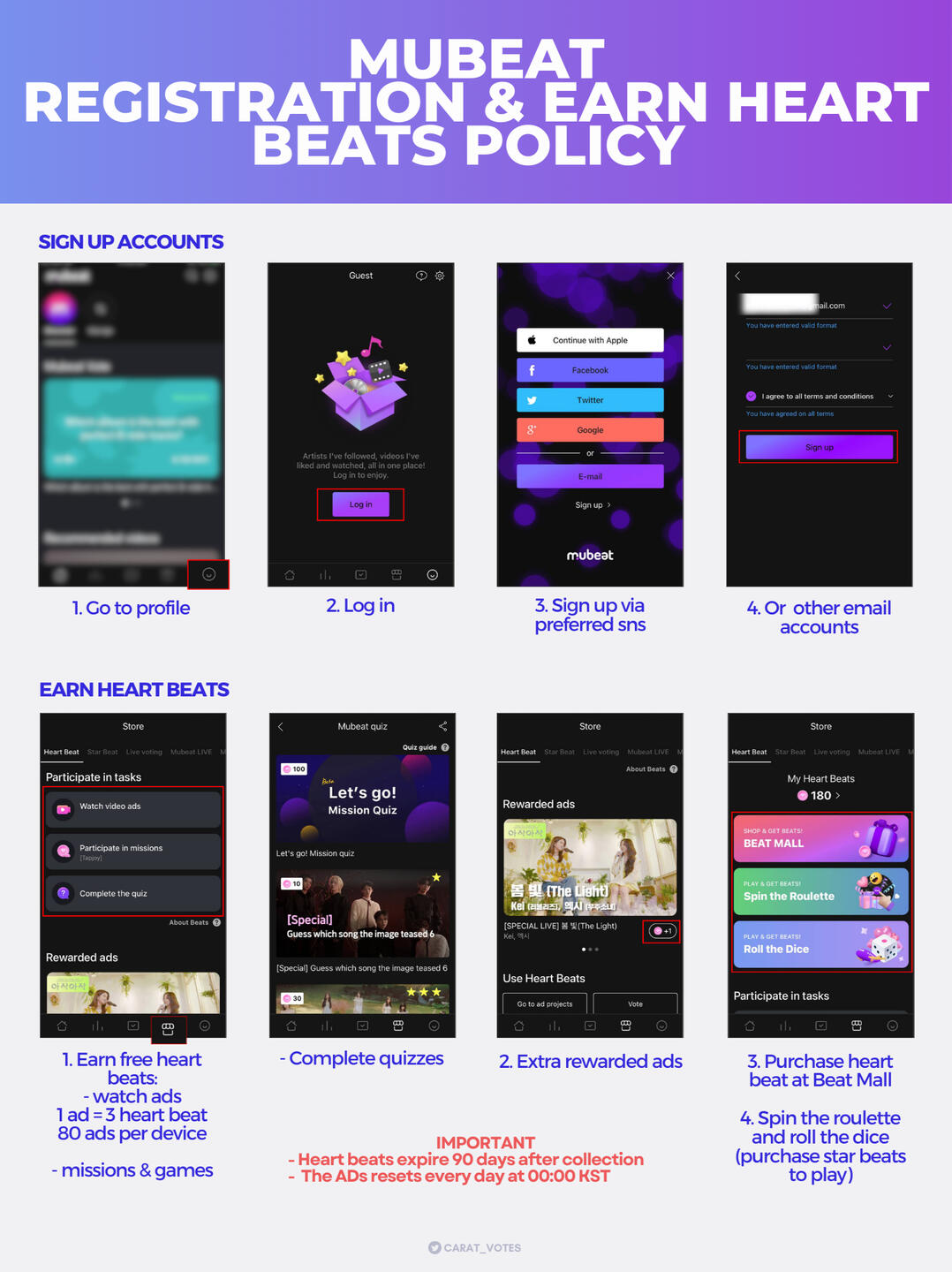 • Earn heart beats by watching ADs, answers mubeat quizzes, and participate in missions.