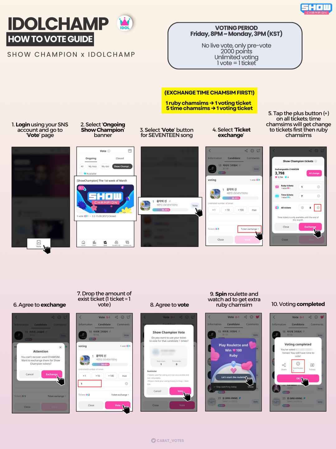 Show Champion voting opens on every Friday at 8 PM (KST) and closes on Monday at 3 PM (KST), which is 4 days long.Install App: Global appCREATE AN ACCOUNT• Log in or Sign up using your Google, Facebook, Kakao or Line account.