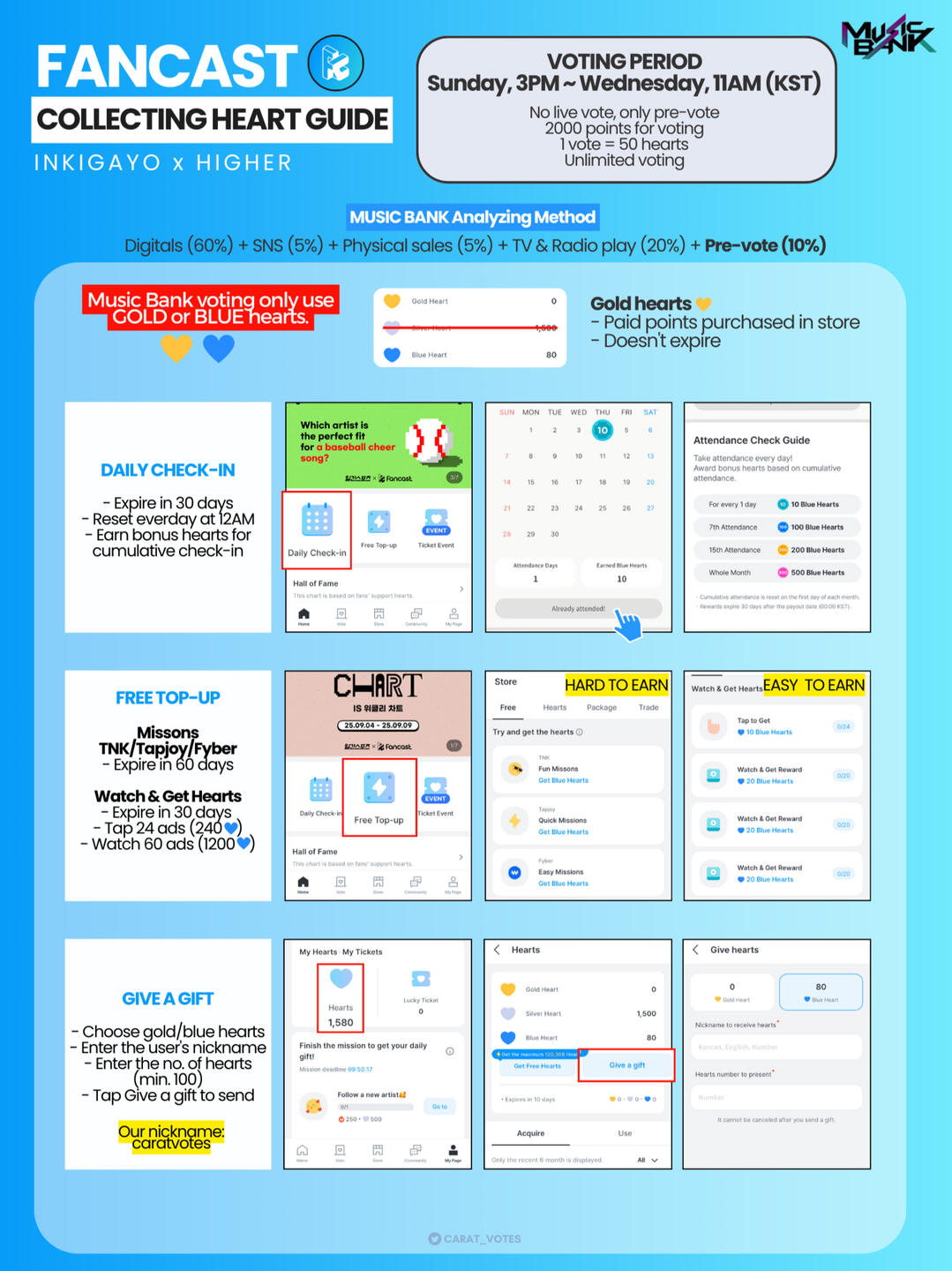 • Set language app and birthdateMusic Bank voting only use GOLD (paid) or BLUE (free) hearts.Gold hearts